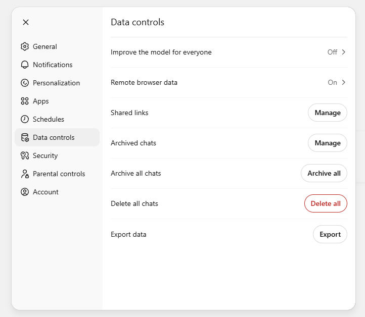 - Go to Data Controls and toggle off "Improve the model for everyone"